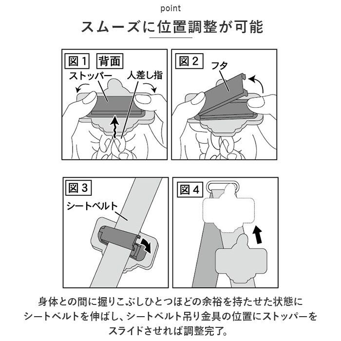 ・身体との間に握りこぶしひとつほどの余裕を持たせた状態にシートベルトを伸ばし、シートベルト吊り金具の位置にストッパーをスライドさせれば調整完了。