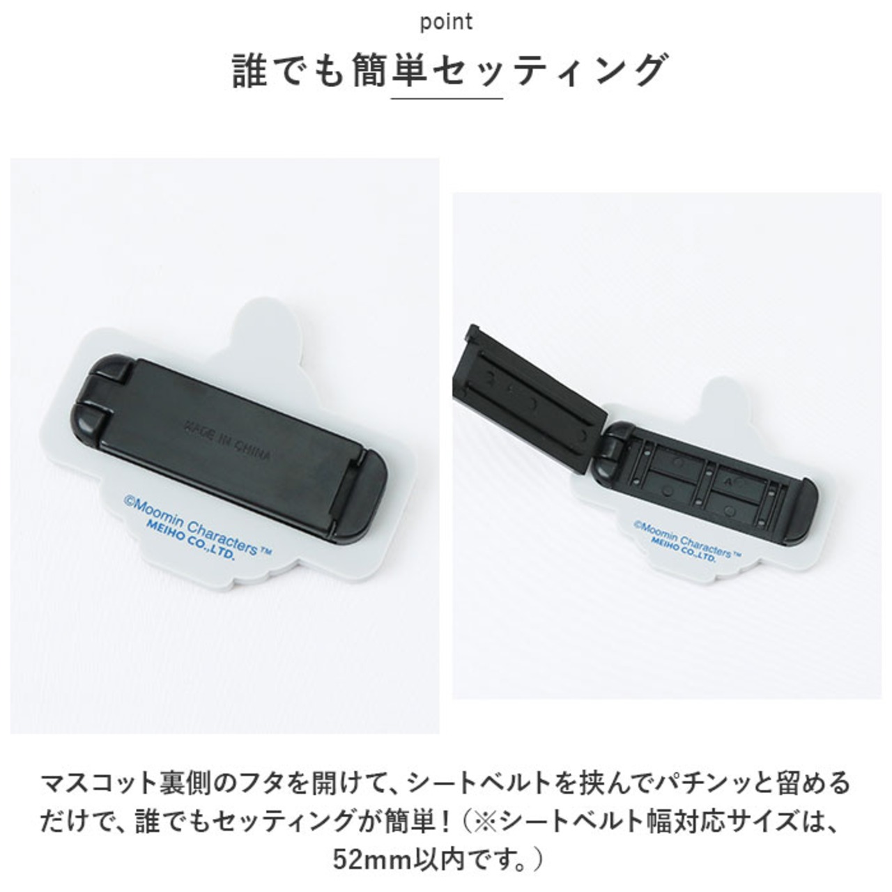 ・マスコット裏側のフタを開けて、シートベルトを挟んでパチンッと留めるだけで、誰でもセッティングが簡単!(※シートベルト幅対応サイズは、52mm以内です。)