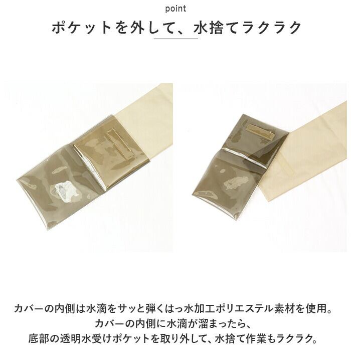 ・カバーの内側は水滴をサッと弾くはっ水加工ポリエステル素材を使用。カバーの内側に水滴が溜まったら、底部の透明水受けポケットを取り外して、水捨て作業もラクラク。