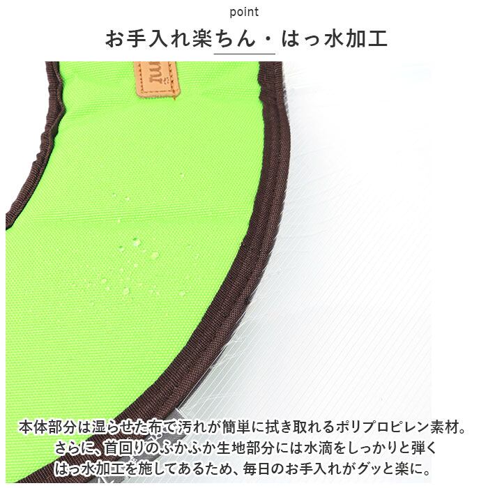 ・本体部分は湿らせた布で汚れが簡単に拭き取れるポリプロピレン素材。さらに、首回りのふかふか生地部分には水滴をしっかりと弾くはっ水加工を施してあるため、毎日のお手入れがグッと楽に。