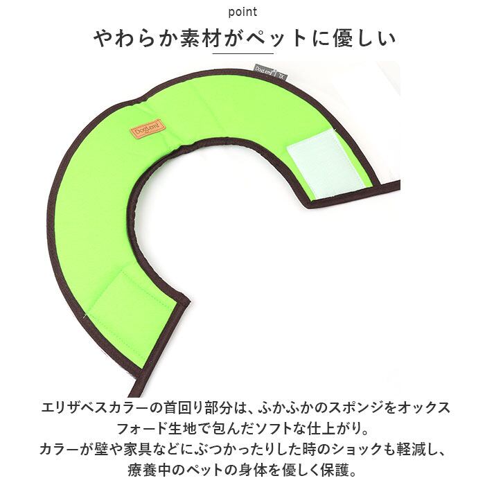 ・エリザベスカラーの首回り部分は、ふかふかのスポンジをオックスフォード生地で包んだソフトな仕上がり。カラーが壁や家具などにぶつかったりした時のショックも軽減し、療養中のペットの身体を優しく保護。