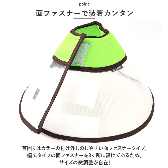 ・首回りはカラーの付け外しのしやすい面ファスナータイプ。幅広タイプの面ファスナーを3ヶ所に設けてあるため、サイズの微調整が自在!