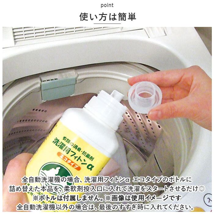 ・全自動洗濯機の場合、洗濯用フィトンαのボトルに詰め替えた本品を、柔軟剤投入口に入れて洗濯をスタートさせるだけ◎(※ボトルは付属しません。全自動洗濯機以外の場合は、最後のすすぎ時に入れてください。)