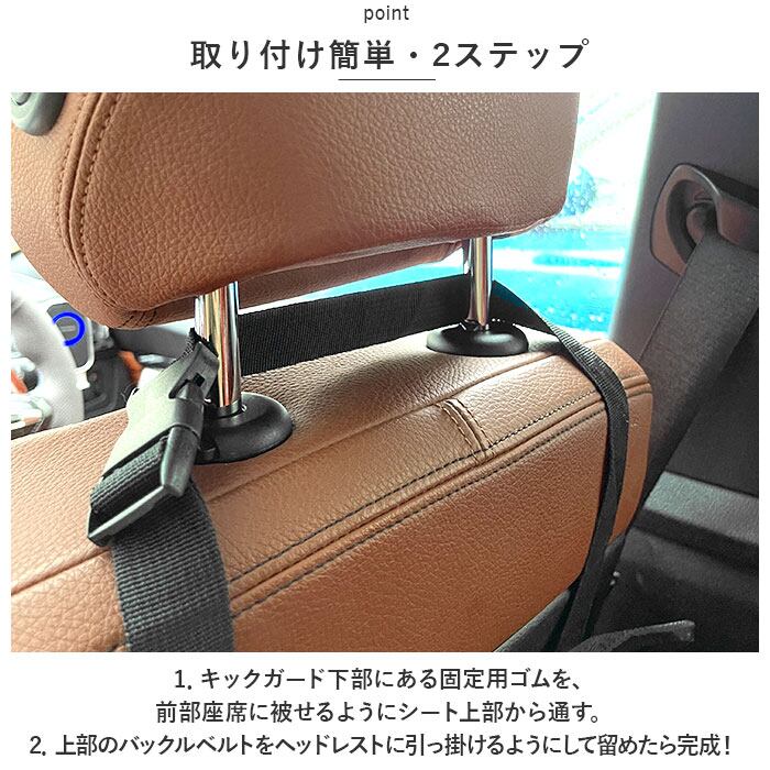 1.キックガード下部にある固定用ゴムを、前部座席に被せるようにシート上部から通す。