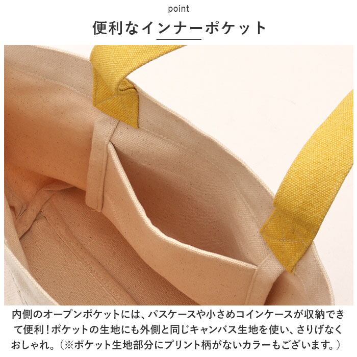 ・内側のオープンポケットには、パスケースや小さめコインケースが収納できて便利!ポケットの生地にも外側と同じキャンバス生地を使い、さりげなくおしゃれ。(※ポケット生地部分にプリント柄がないカラーもございます。)