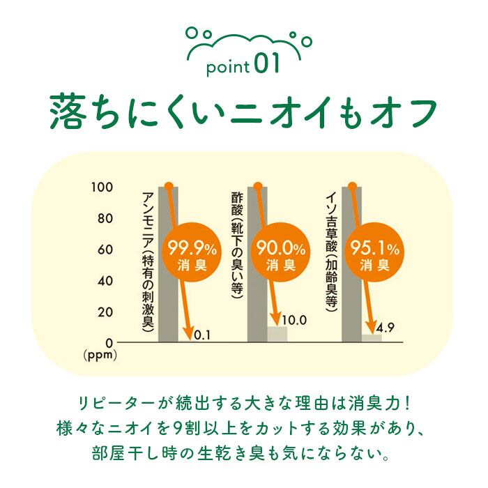 ・芳香効果もあり、洗い上がりはほのかな森の香りが広がる!洗濯しても落ちにくいニオイやアンモニア臭、部屋干し時の生乾き臭を消臭!