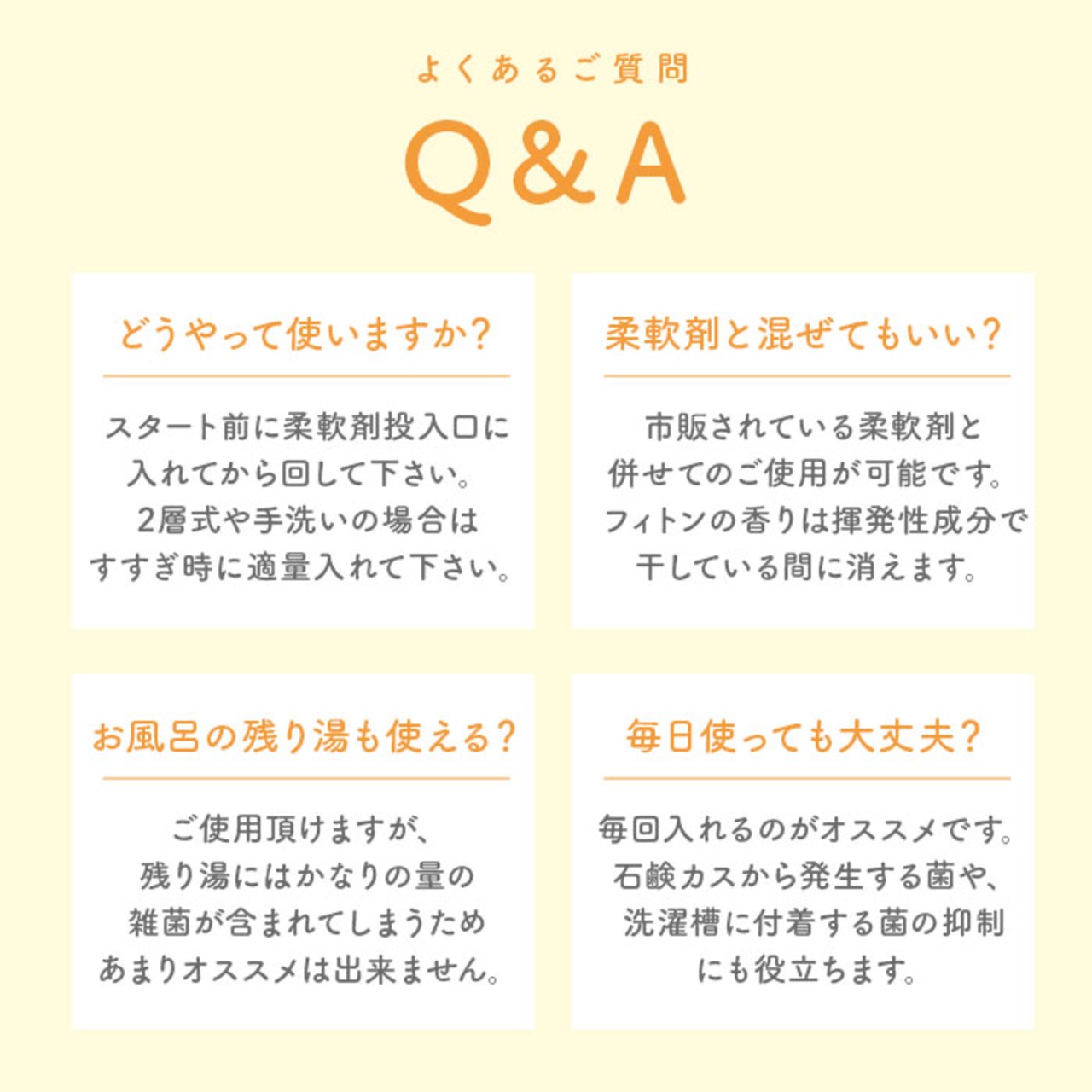 ・全自動洗濯機の場合、洗濯用フィトンα エコタイプのボトルに詰め替えた本品を、柔軟剤投入口に入れて洗濯をスタートさせるだけ◎(※ボトルは付属しません。全自動洗濯機以外の場合は、最後のすすぎ時に入れてください。)