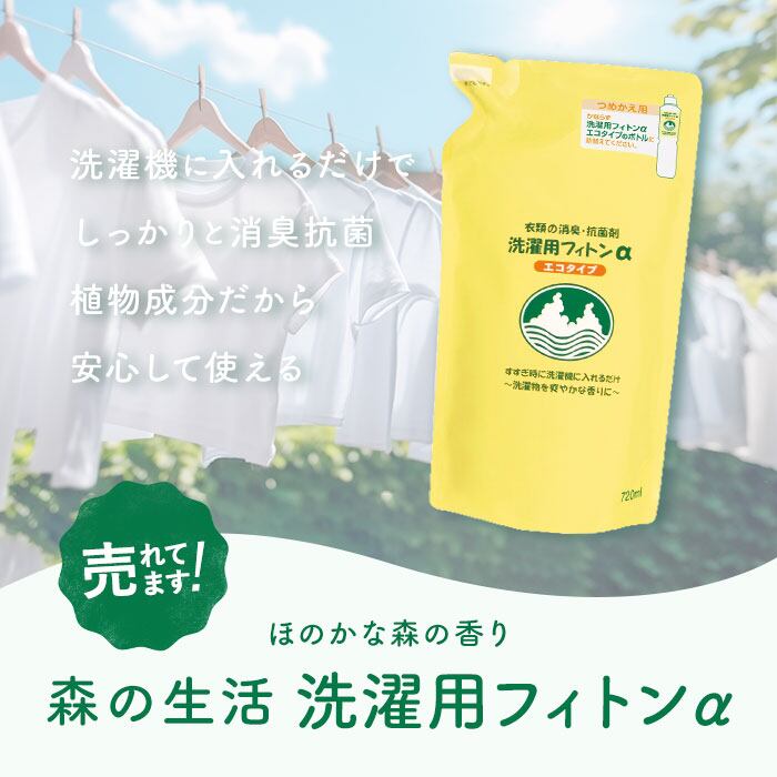 ・お洗濯の味方☆落ちにくいニオイをオフしてくれる「森の生活 洗濯用フィトンα エコタイプ」詰め替え用720mlの3個セット。