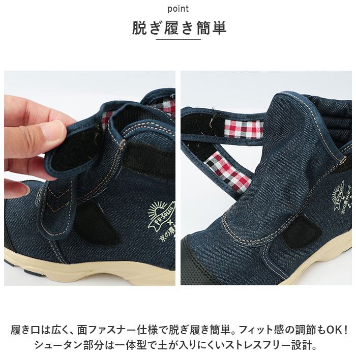 ・履き口は広く、面ファスナー仕様で脱ぎ履き簡単。フィット感の調節もOK!シュータン部分は一体型で土が入りにくいストレスフリー設計。