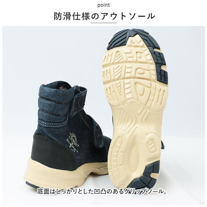 ・デニム生地と内側のチェック柄がカジュアルな印象で、サイドのロゴがアクセントになったおしゃれなシューズ。農作業はもちろん、ガーデニングにもピッタリ!