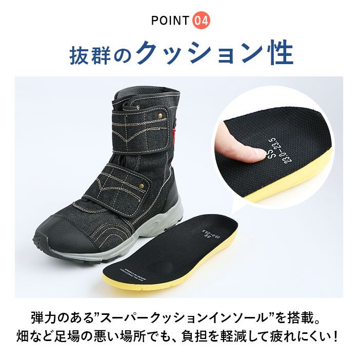 ・弾力のある”スーパークッションインソール”を搭載。足裏にかかる負担を軽減し、畑など足場の悪い場所でも疲れにくい!インソールは取り外せて衛生的。