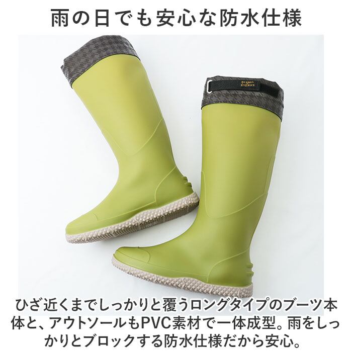 ・ひざ近くまでしっかりと覆うロングタイプのブーツ本体と、アウトソールもPVC素材で一体成型。雨をしっかりとブロックする防水仕様だから安心。