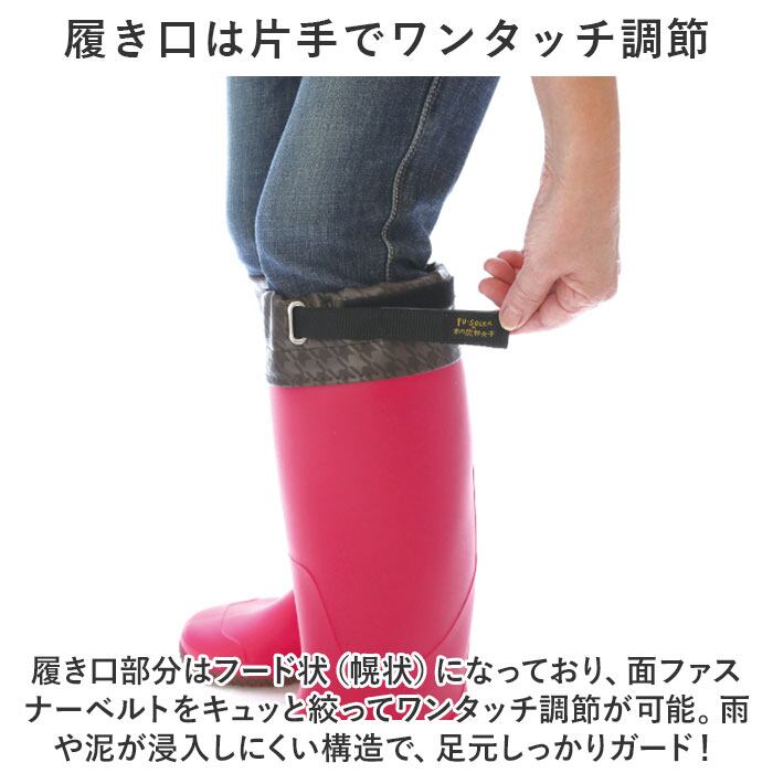 ・履き口部分はフード状(幌状)になっており、面ファスナーベルトを片手でキュッと絞ってワンタッチ調節が可能。雨や泥が浸入しにくい構造で、足元しっかりガード!
