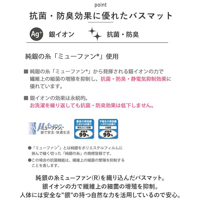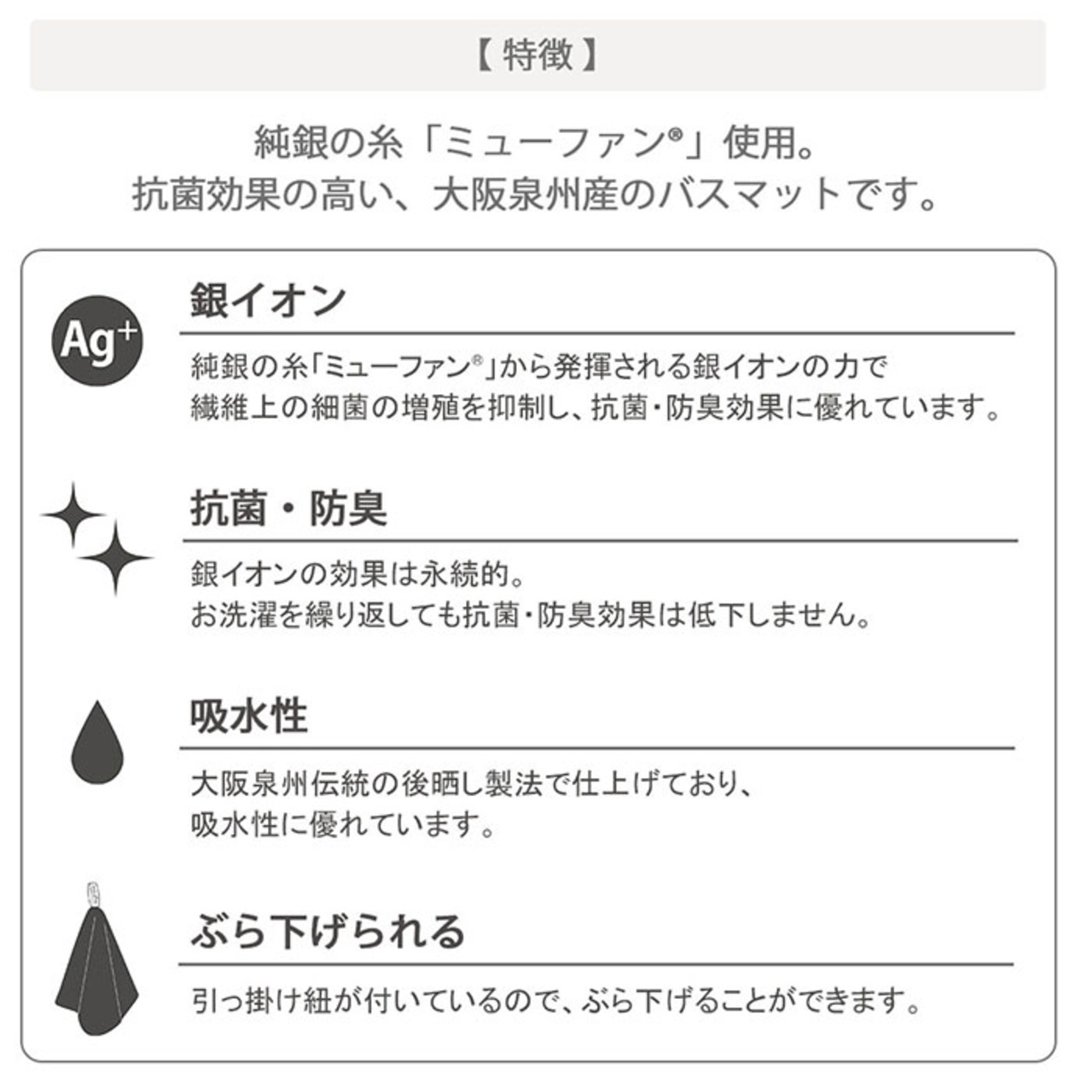 ・純銀の糸ミューファン(R)を織り込んだバスマット。銀イオンの力で繊維上の細菌の増殖を抑制。人体には安全な”銀”の持つ自然な力を活用しているので安心。