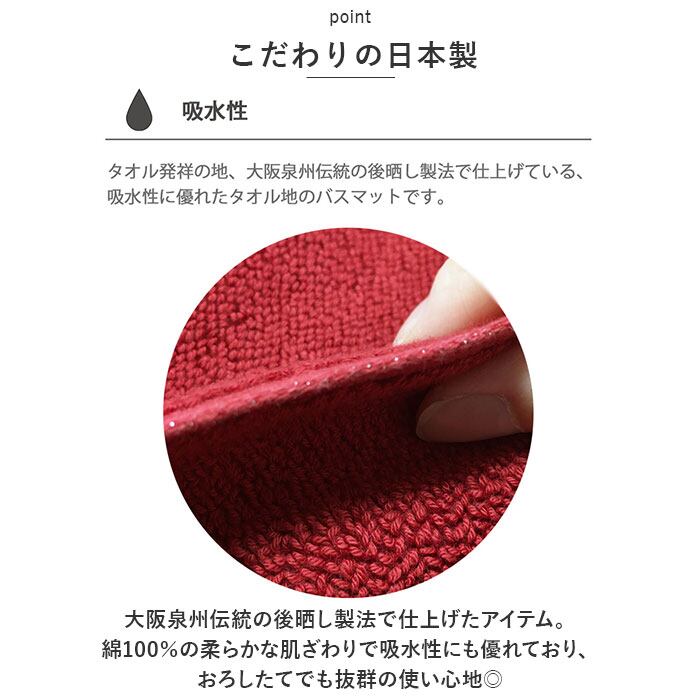 ・大阪泉州伝統の後晒し製法で仕上げたアイテム。綿100%の柔らかな肌ざわりで吸水性にも優れており、おろしたてでも抜群の使い心地◎