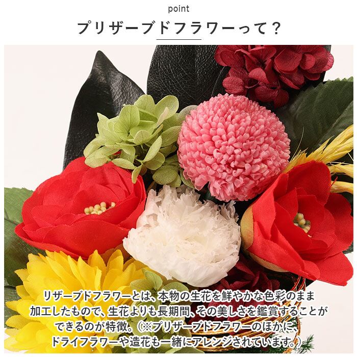 ・リザーブドフラワーとは、本物の生花を鮮やかな色彩のまま加工したもので、生花よりも長期間、その美しさを鑑賞することができるのが特徴。(※プリザーブドフラワーのほかに、ドライフラワーや造花も一緒にアレンジされています。)