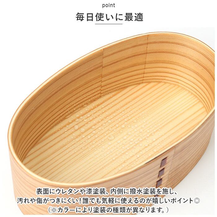 ・丈夫で耐久性に優れたわっぱ弁当箱。温かみのある天然木の素地を使い、1つ1つ手作りされたアイテム。