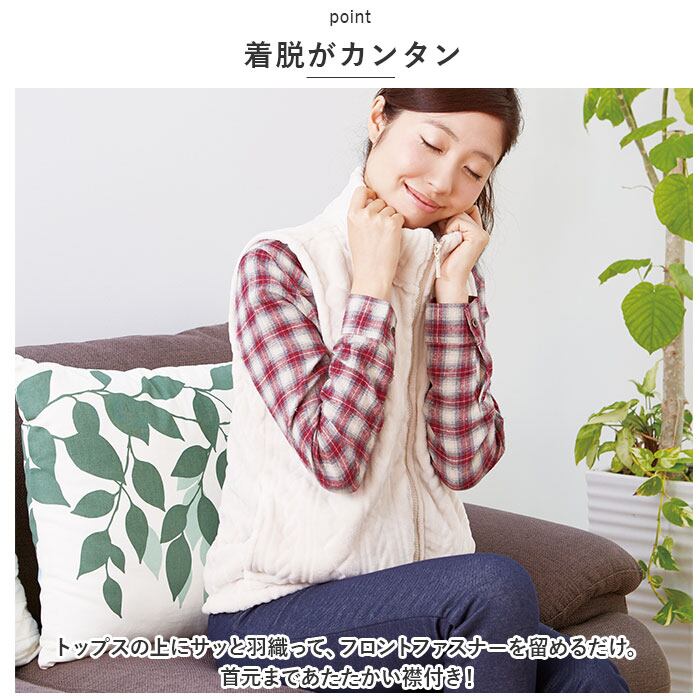 ・トップスの上にサッと羽織って、フロントファスナーを留めるだけ。首元まであたたかい襟付き!