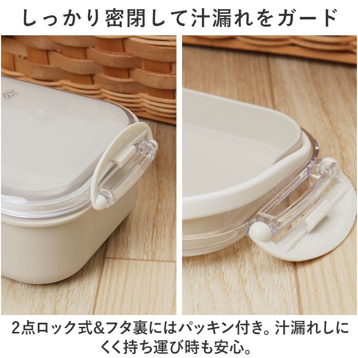 ・2点ロック式&フタ裏にはパッキン付き。汁漏れしにくく持ち運び時も安心。