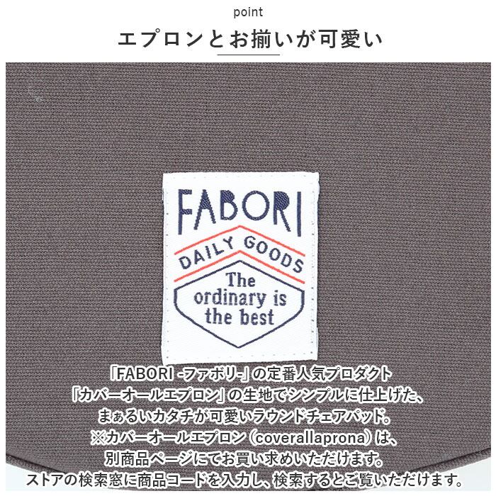 ・「FABORI -ファボリ-」の定番人気プロダクト「カバーオールエプロン」の生地でシンプルに仕上げた、まぁるいカタチが可愛いラウンドチェアパッド。(※カバーオールエプロン(coverallaprona)は、別商品ページにてお買い求めいただけます。ストアの検索窓に商品コードを入力し、検索するとご覧いただけます。)