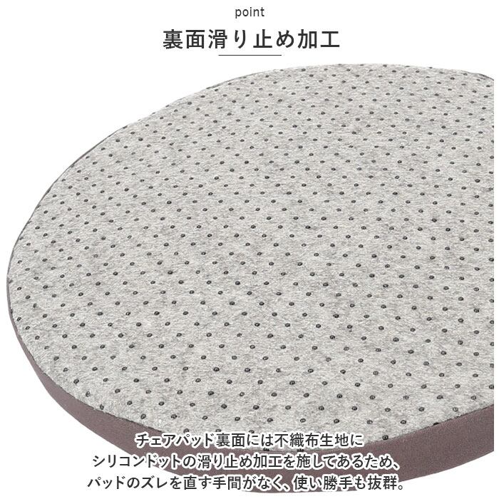 ・チェアパッド裏面には不織布生地にシリコンドットの滑り止め加工を施してあるため、パッドのズレを直す手間がなく、使い勝手も抜群。