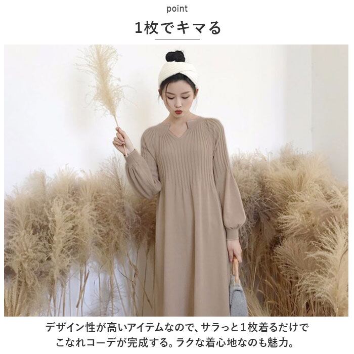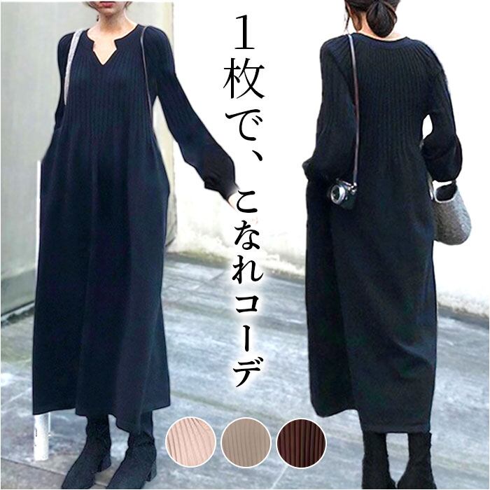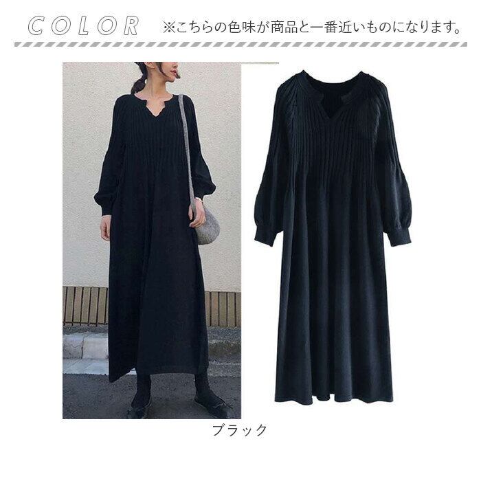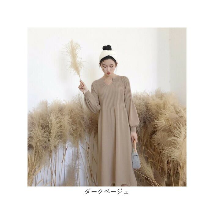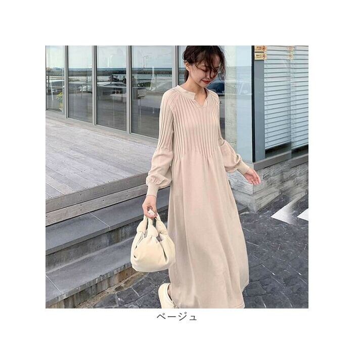 ワンピース レディース ニット きれいめ 通販 ワンピ 長袖 プリーツ パフスリーブ Vネック ロング丈 マキシ丈 体型カバー 無地 着回し リブニット ハイウエスト 秋 春 冬 エレガント フェミニン おしゃれ