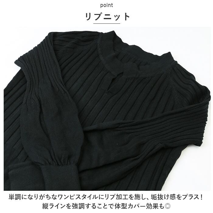 ・単調になりがちなワンピスタイルにリブ加工を施し、垢抜け感をプラス!縦ラインを強調することで体型カバー効果も◎