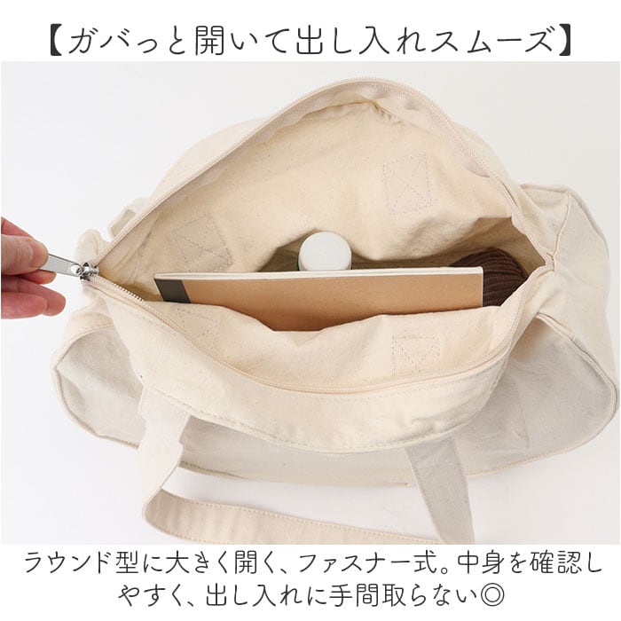 ・ラウンド型に大きく開く、ファスナー式。中身を確認しやすく、出し入れに手間取らない◎
