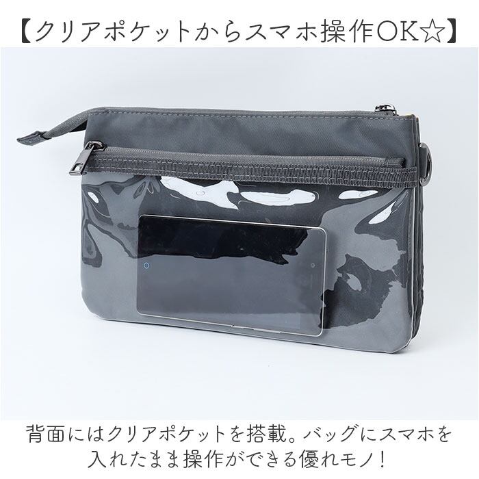 ・背面にはクリアポケットを搭載。バッグにスマホを入れたまま操作ができる優れモノ!