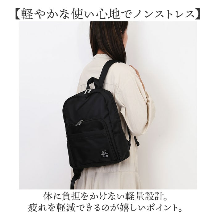 ・背面にはメイン収納に直結した便利なポケット付きで、バッグを下ろさなくてもサッと出し入れ。