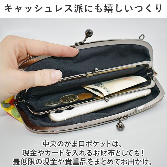 ・中央のがま口ポケットは、現金やカードを入れるお財布としても!最低限の現金や貴重品をまとめてお出かけ。