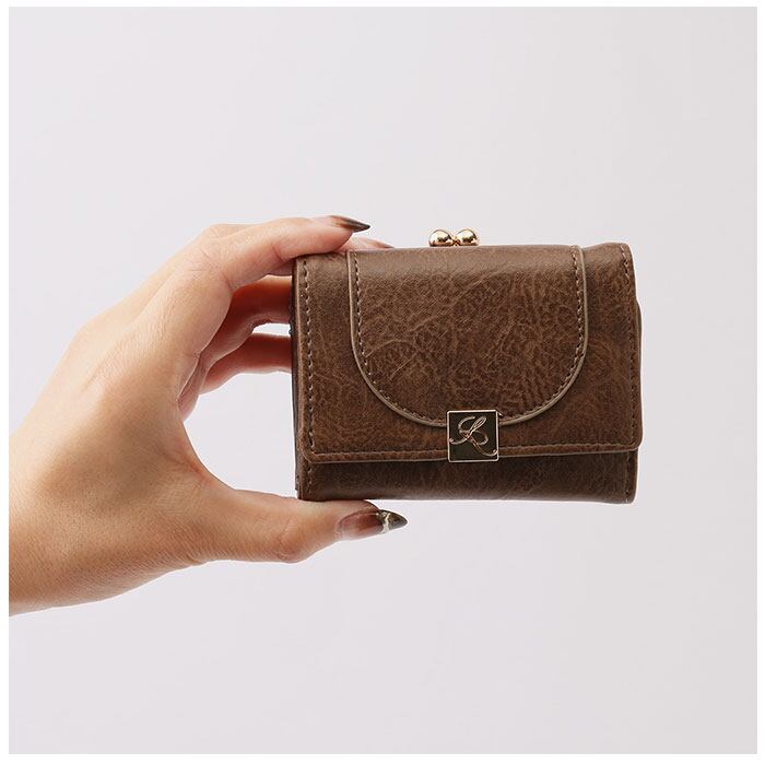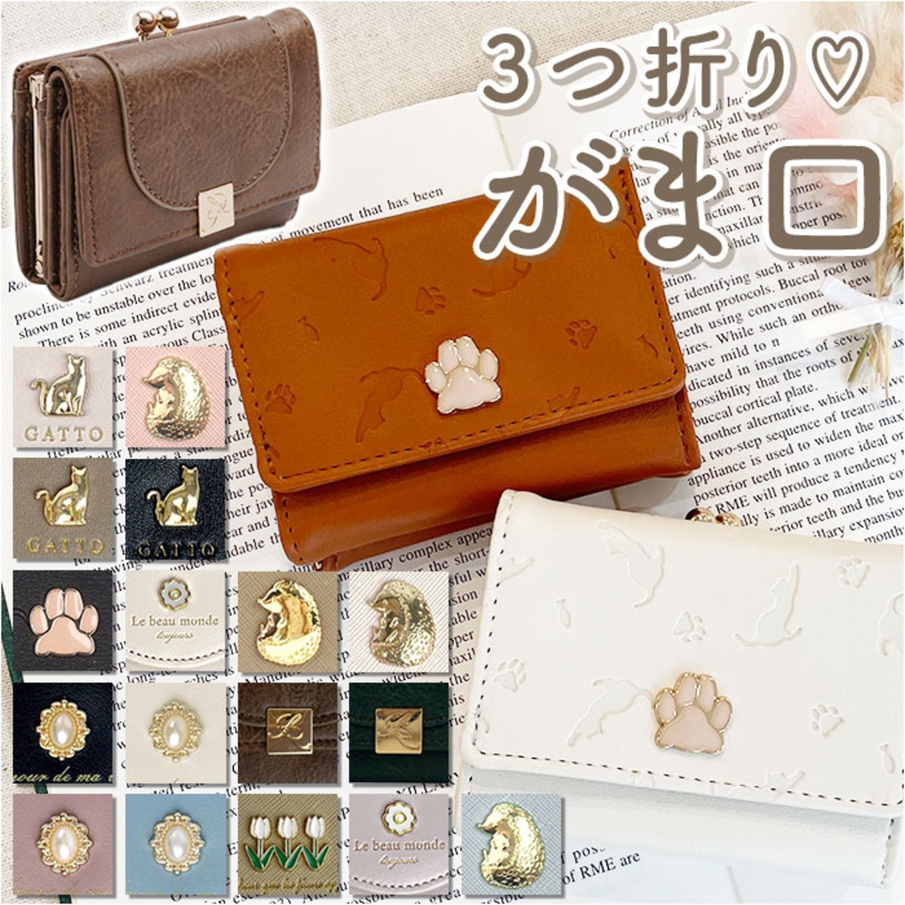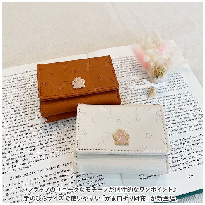 ・フラップのユニークなモチーフが個性的なワンポイント♪手のひらサイズで使いやすい「がま口折り財布」が新登場。
