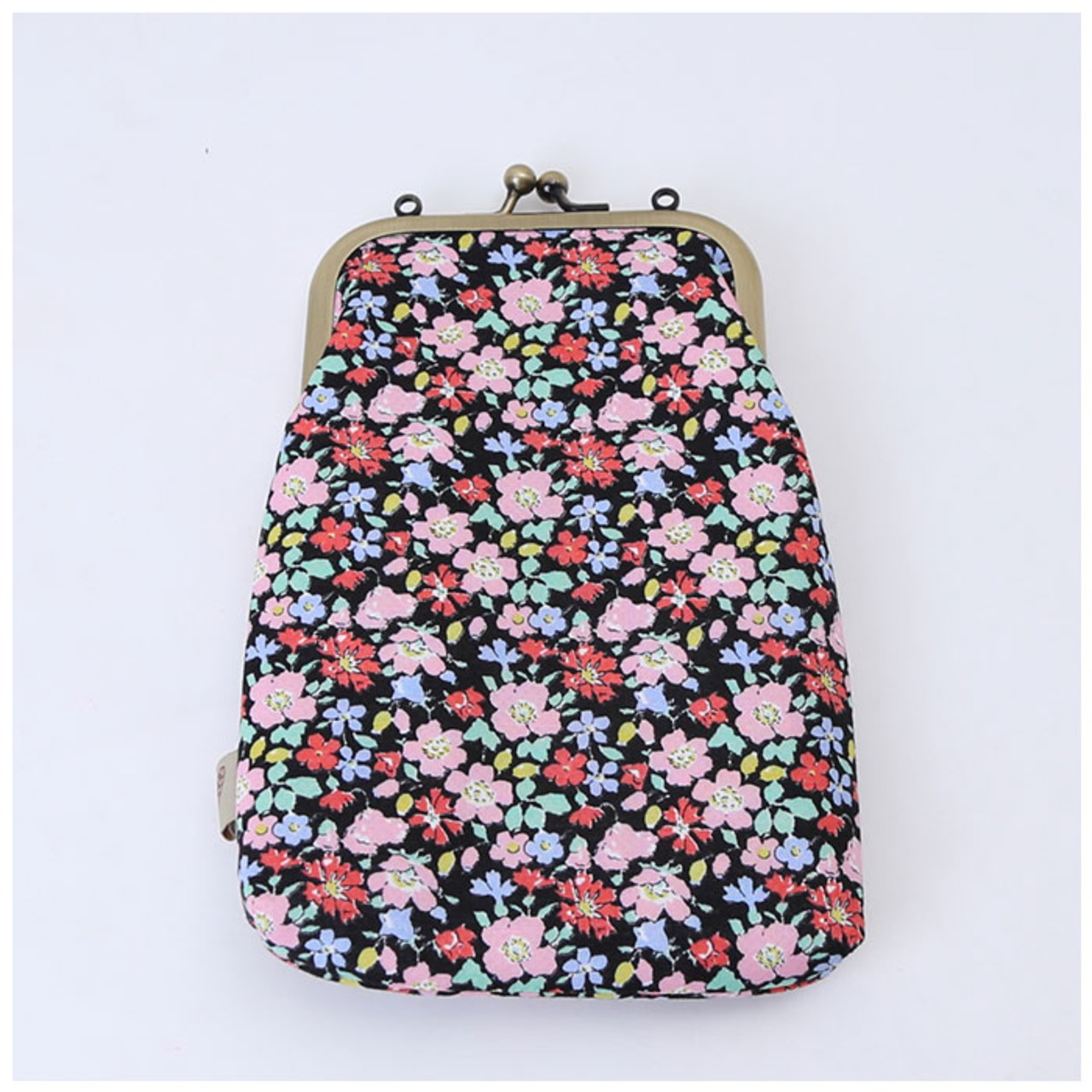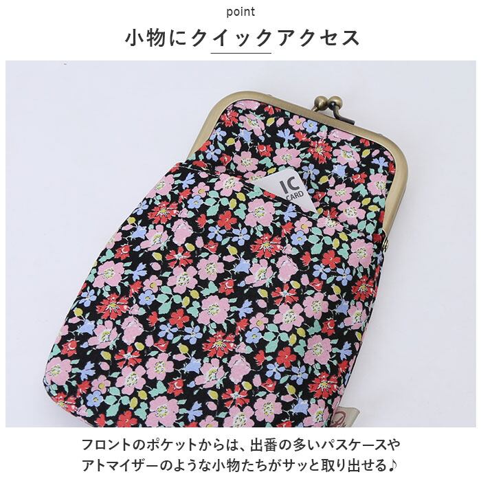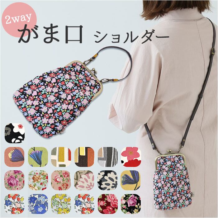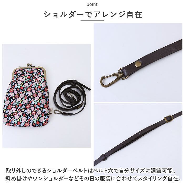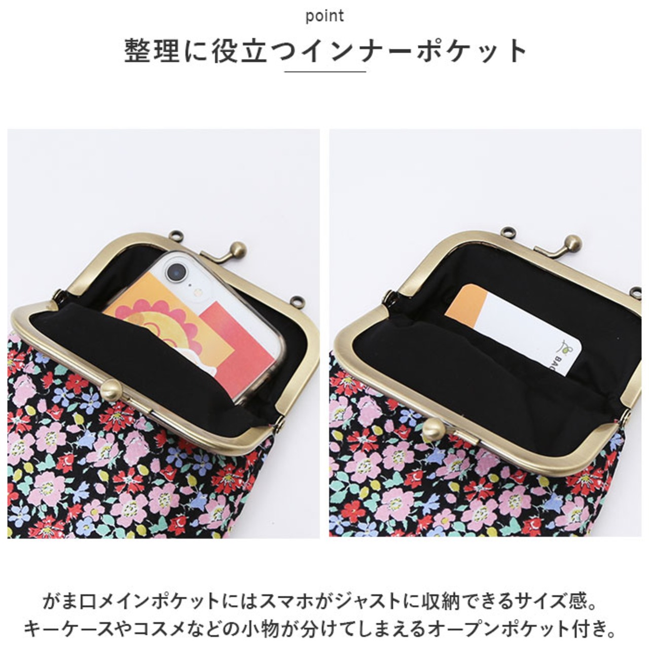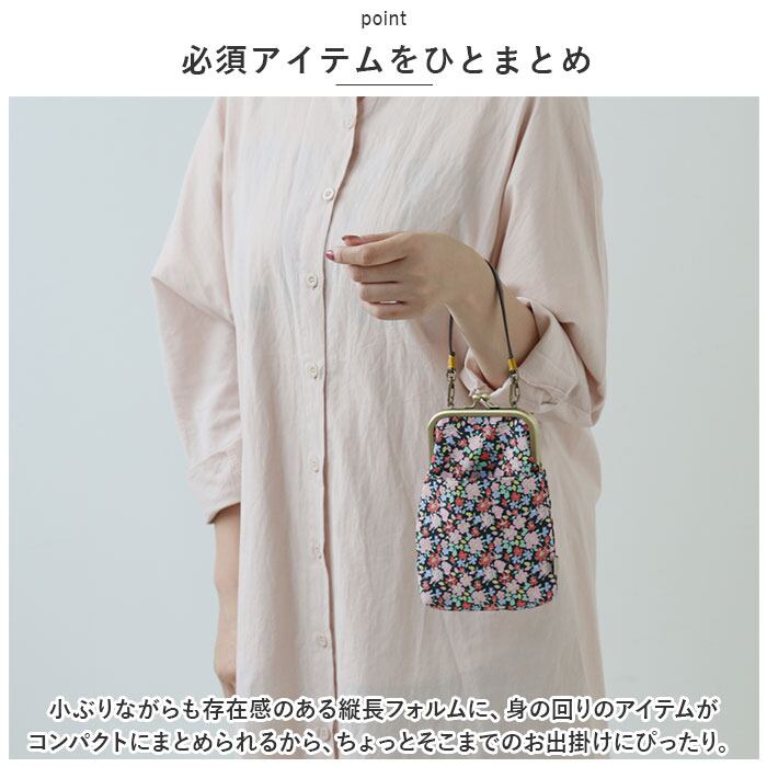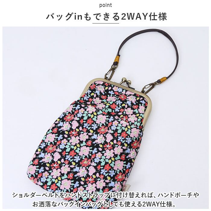 「レトロながま口スタイル×リバティー柄」の華やかなコラボ♪ファッションの素敵なワンポイントになる「がま口 2WAYスマホショルダー」が新登場。