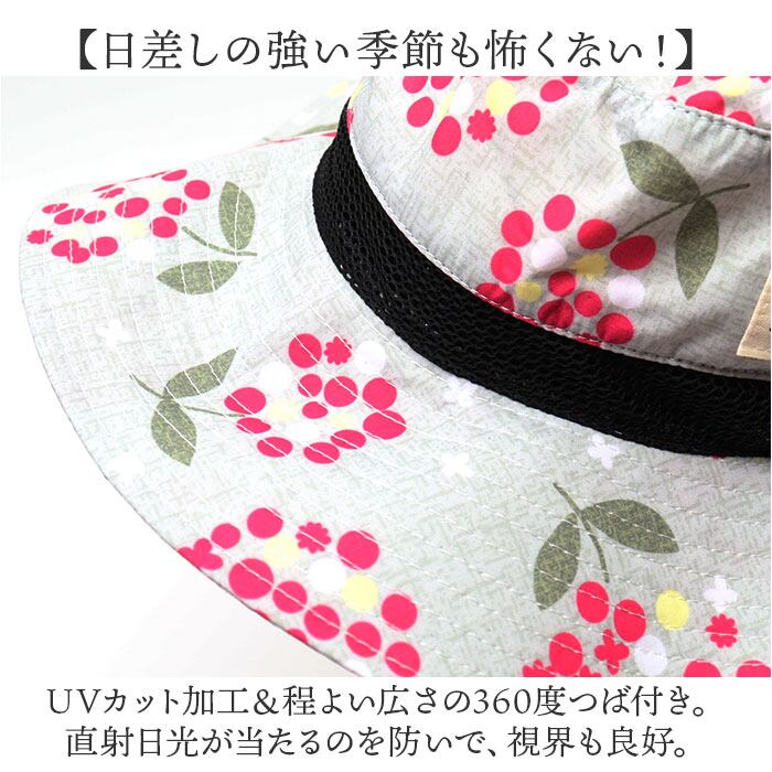 ・UVカット加工&程よい広さの360度つば付き。直射日光が当たるのを防いで、視界も良好。