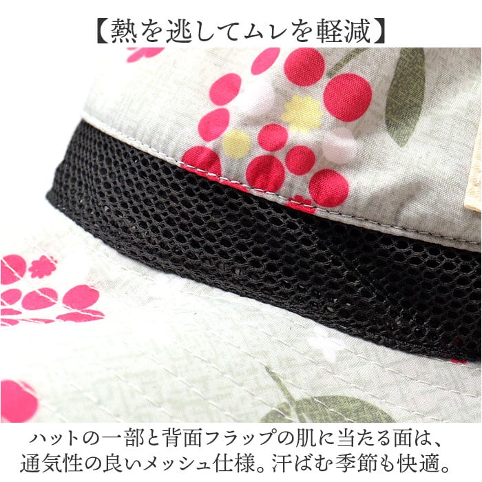 ・ハットの一部と背面フラップの肌に当たる面は、通気性の良いメッシュ仕様。汗ばむ季節も快適。