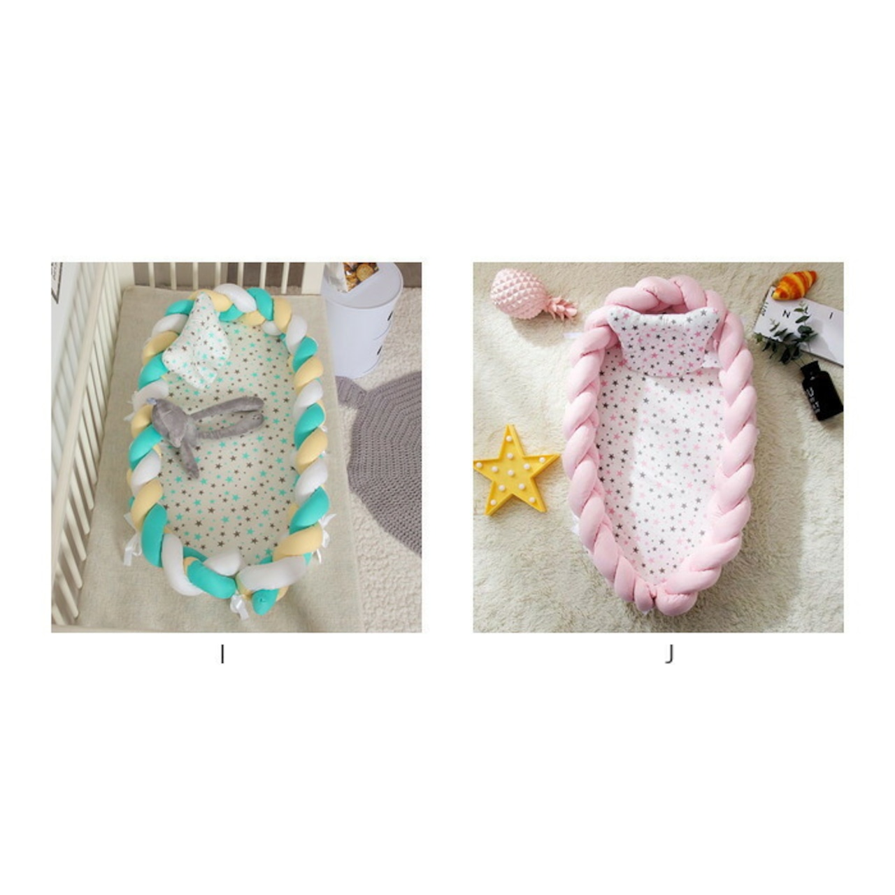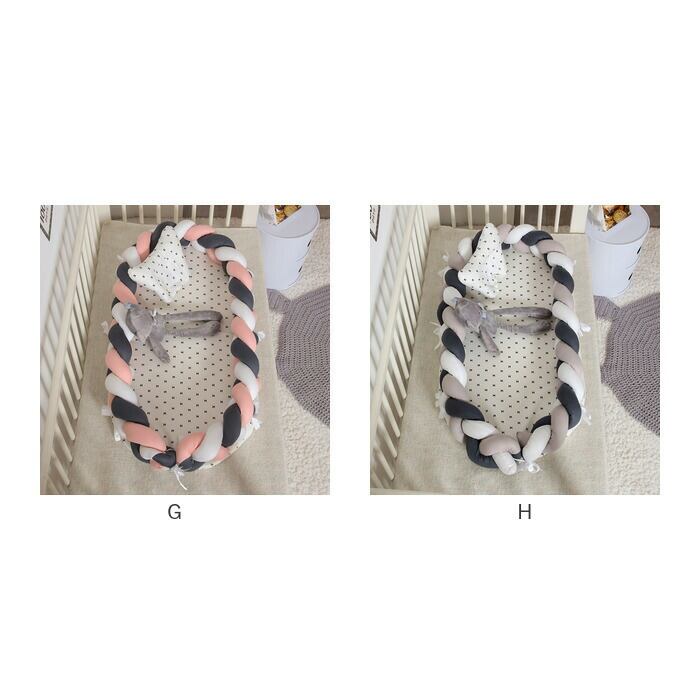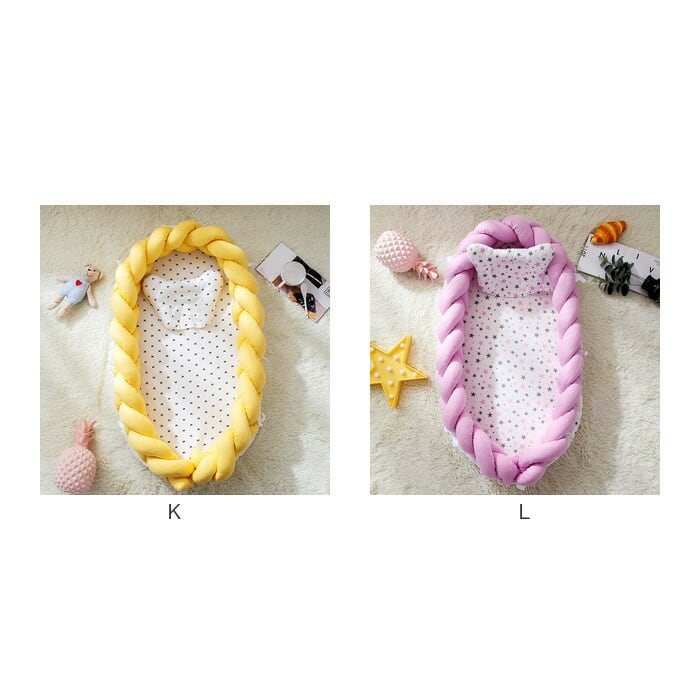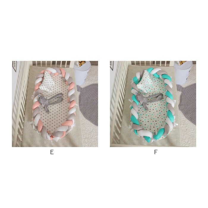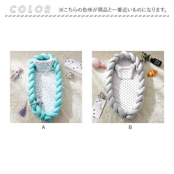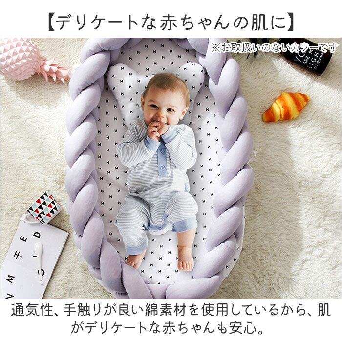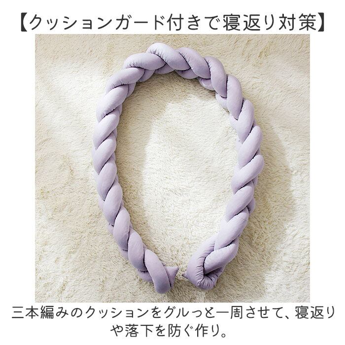 ・三本編みのクッションをグルっと一周させて、寝返りや落下を防ぐ作り。