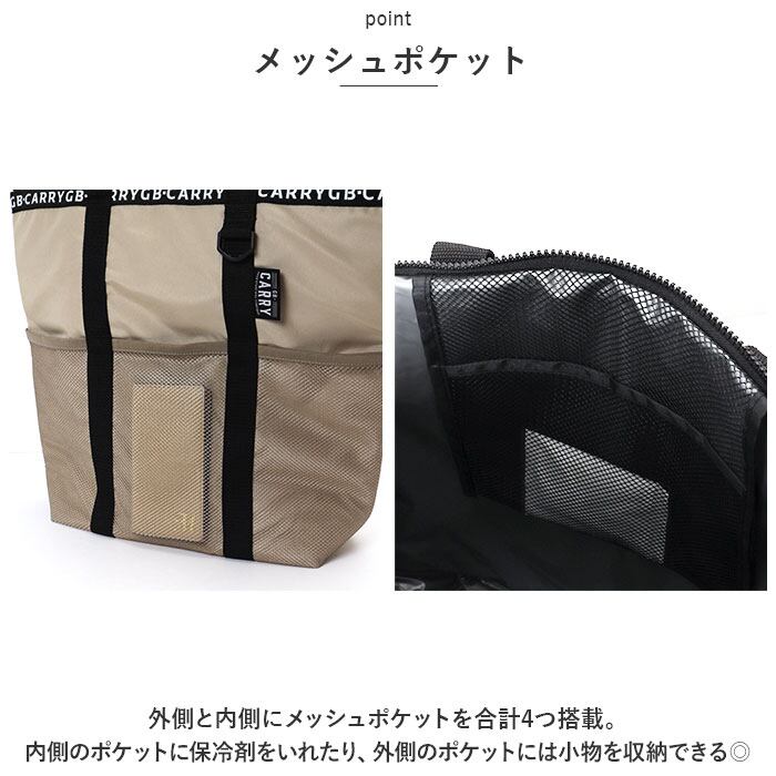 ・外側と内側にメッシュポケットを合計4つ搭載。内側のポケットに保冷剤をいれたり、外側のポケットには小物を収納できる◎