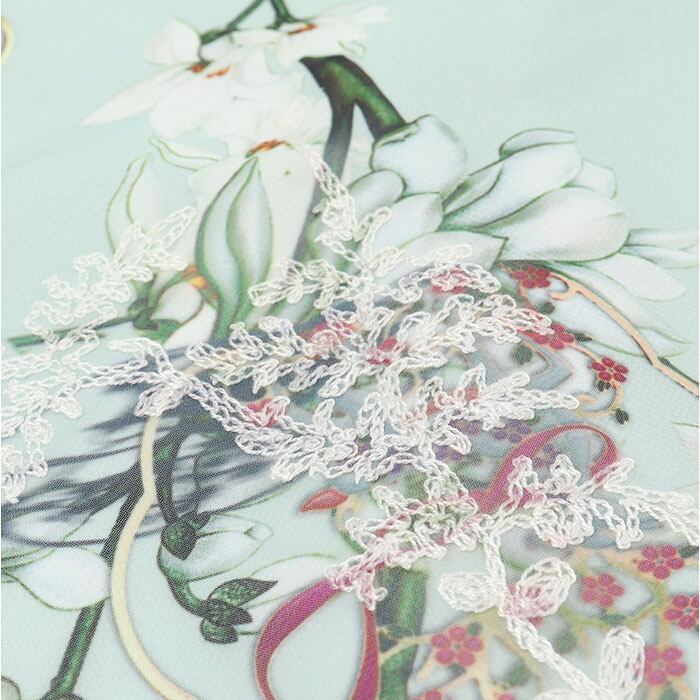 ・大胆な花模様のプリントと、さりげなく刺繍を施したチャイナドレスの雰囲気漂う1着。