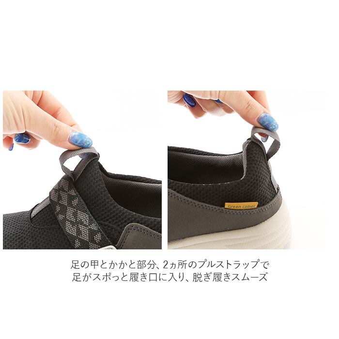 ・足の甲とかかと部分、2ヵ所のプルストラップで足がスポっと履き口に入り、脱ぎ履きスムーズ。
