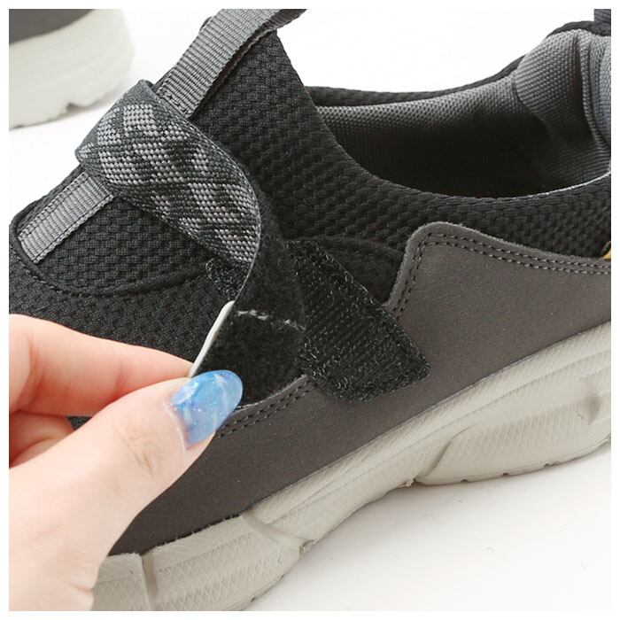 ・面ファスナー式の甲ベルトで甲幅を簡単調節。足の幅が広めの方でも無理なくゆったり歩きやすい!