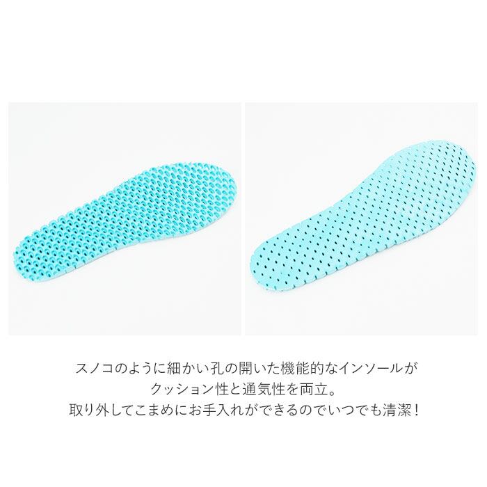 ・スノコのように細かい孔の開いた機能的なインソールが、クッション性と通気性を両立。取り外してこまめにお手入れができるので、いつでも清潔!