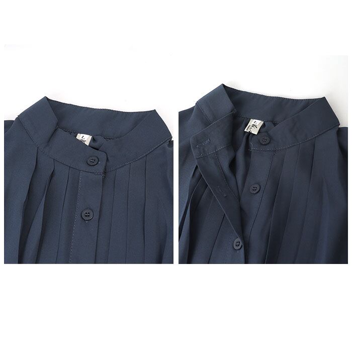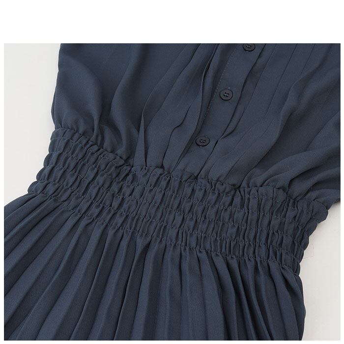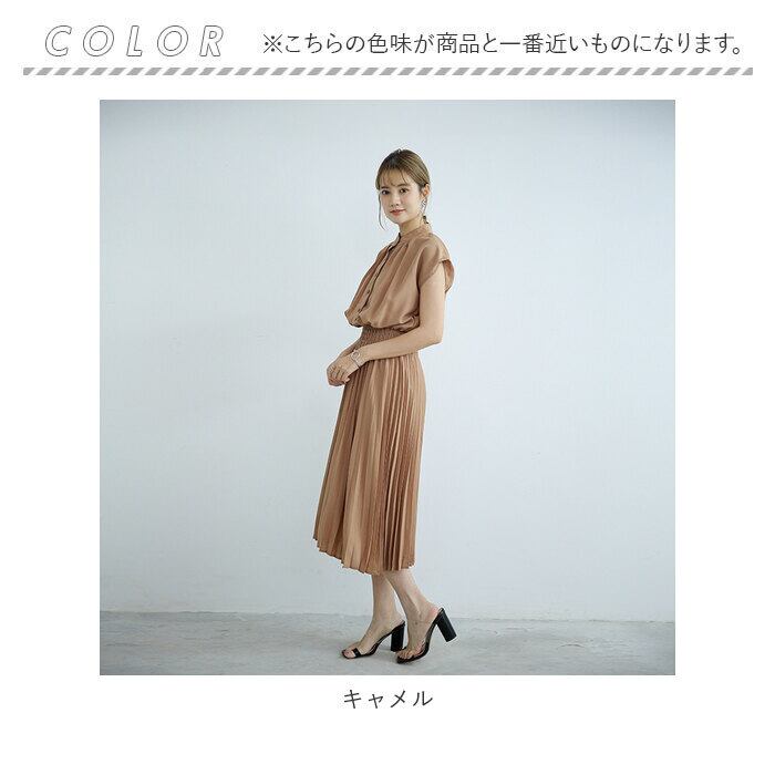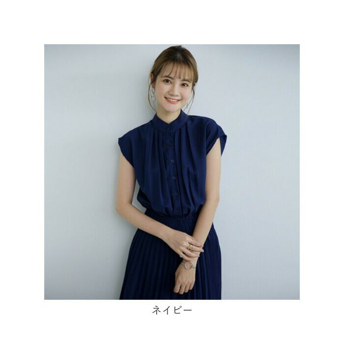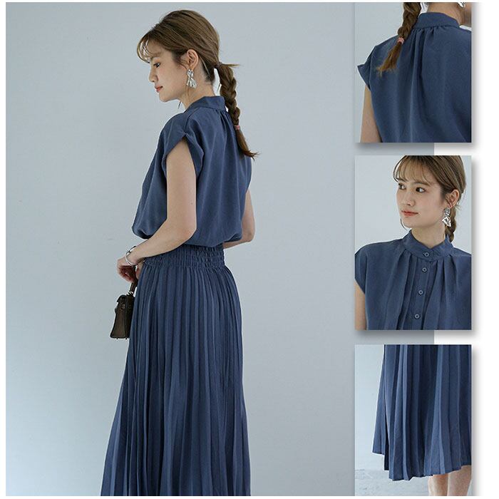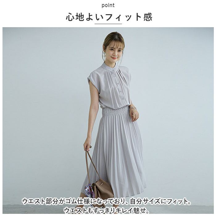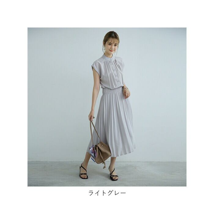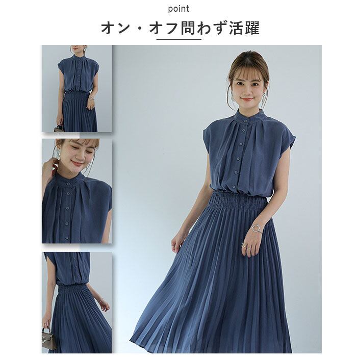 ・上身頃部分はシャツ風、スカート部分はプリーツデザイン。ナチュラルなきちんと感を演出。