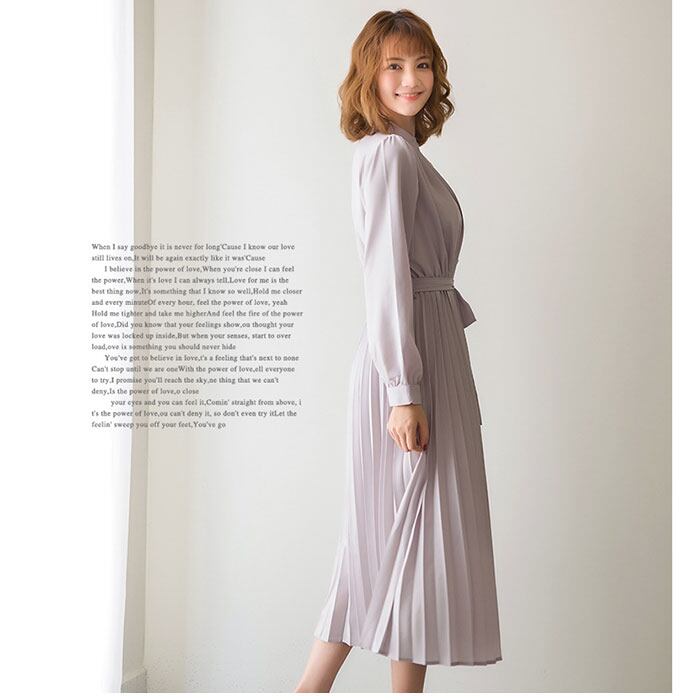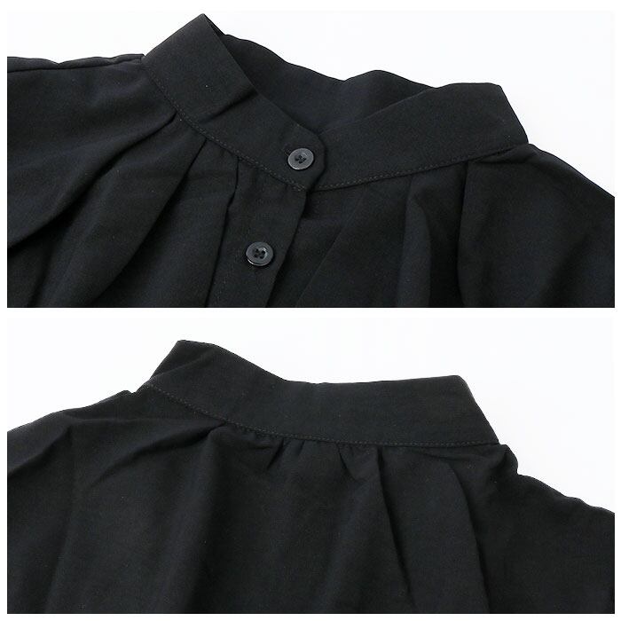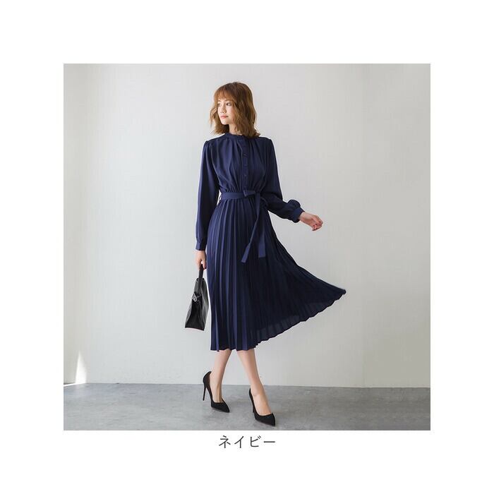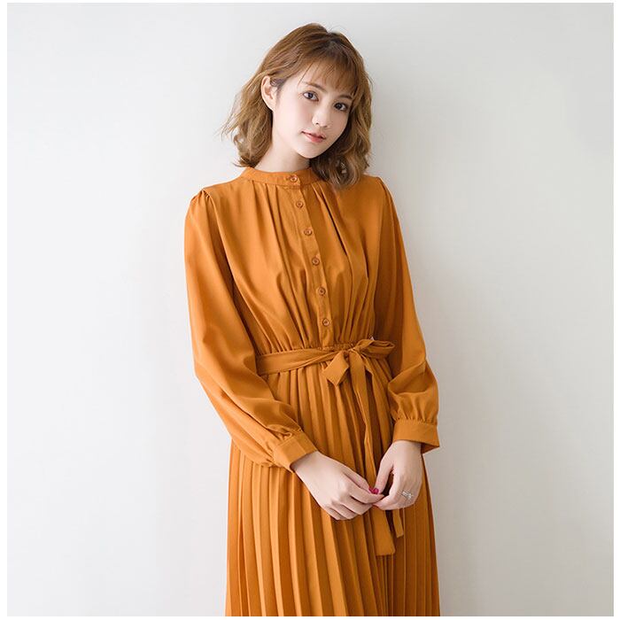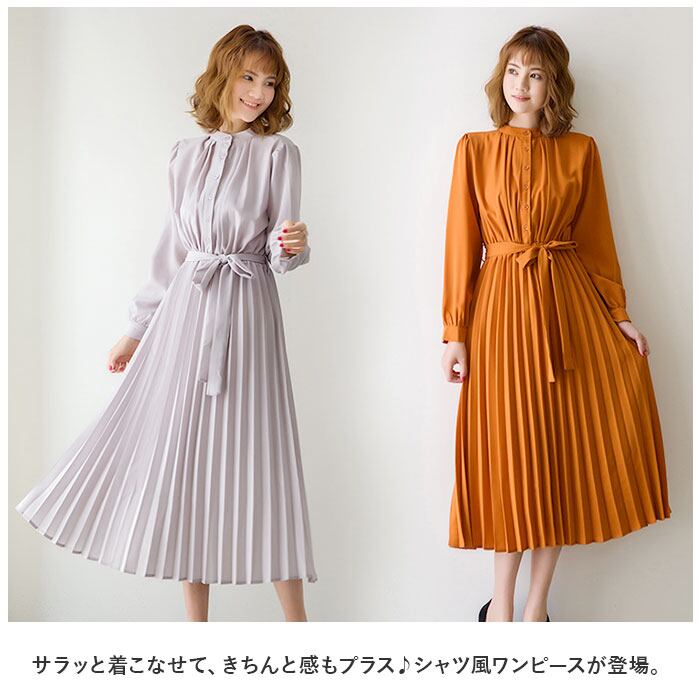 ・上身頃部分はスタンドカラーのシャツ風、スカート部分はプリーツデザイン。ナチュラルながら、キレイめな印象に仕上げた1着。