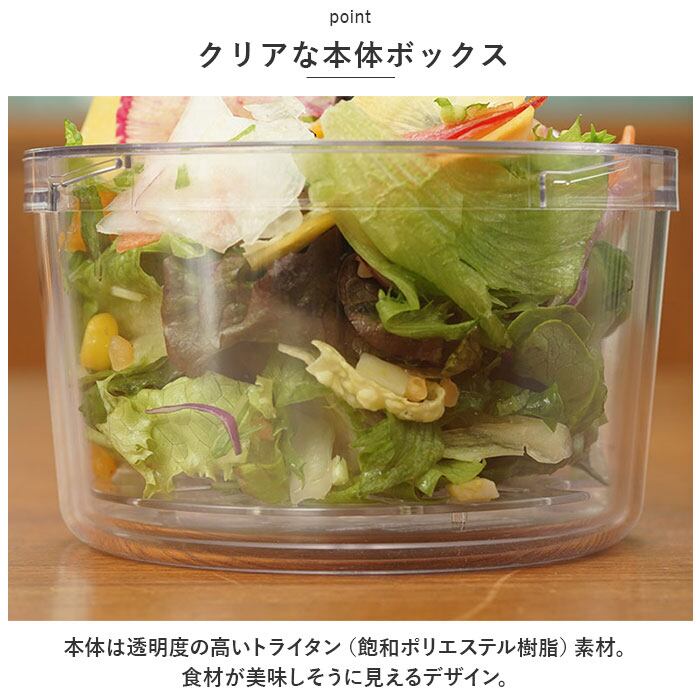 ・本体は透明度の高いトライタン(飽和ポリエステル樹脂)素材。食材が美味しそうに見えるデザイン。