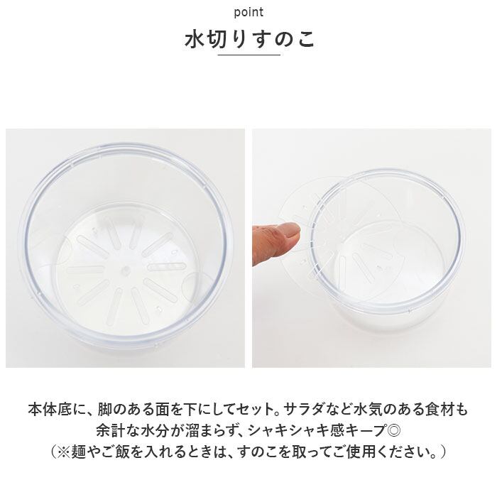 ・本体底に、脚のある面を下にしてセット。サラダなど水気のある食材も余計な水分が溜まらず、シャキシャキ感キープ◎(※麺やご飯を入れるときは、すのこを取ってご使用ください。)