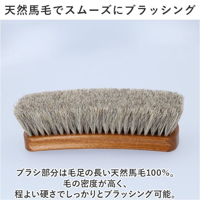 ・ブラシ部分は毛足の長い天然馬毛100%。毛の密度が高く、程よい硬さでしっかりとブラッシング可能。