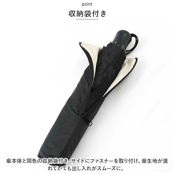 ・傘本体と同色の収納袋付き。サイドにファスナーを取り付け、傘生地が濡れていても出し入れがスムーズに。