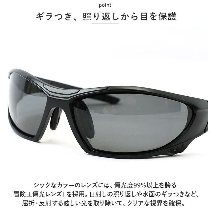 ・シックなカラーのレンズには、偏光度99%以上を誇る「冒険王偏光レンズ」を採用。日射しの照り返しや水面のギラつきなど、屈折・反射する眩しい光を取り除いて、クリアな視界を確保。