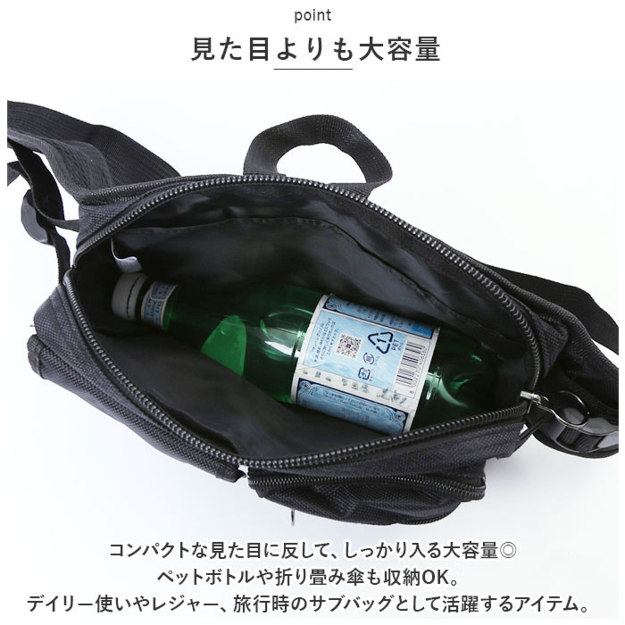 ・コンパクトな見た目に反して、しっかり入る大容量◎ペットボトルや折り畳み傘も収納OK。デイリー使いやレジャー、旅行時のサブバッグとして活躍するアイテム。