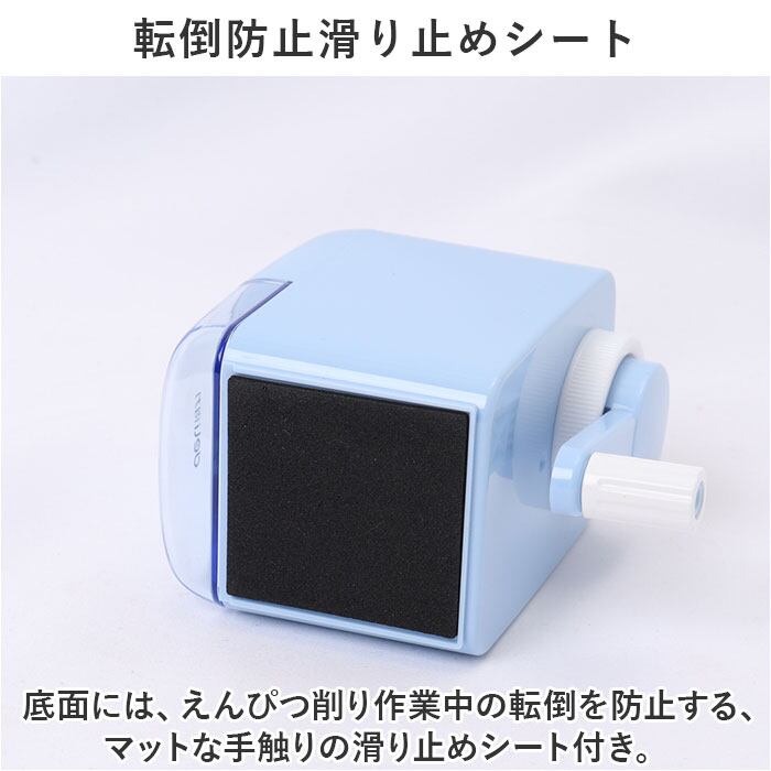 ・底面には、えんぴつ削り作業中の転倒を防止する、マットな手触りの滑り止めシート付き。